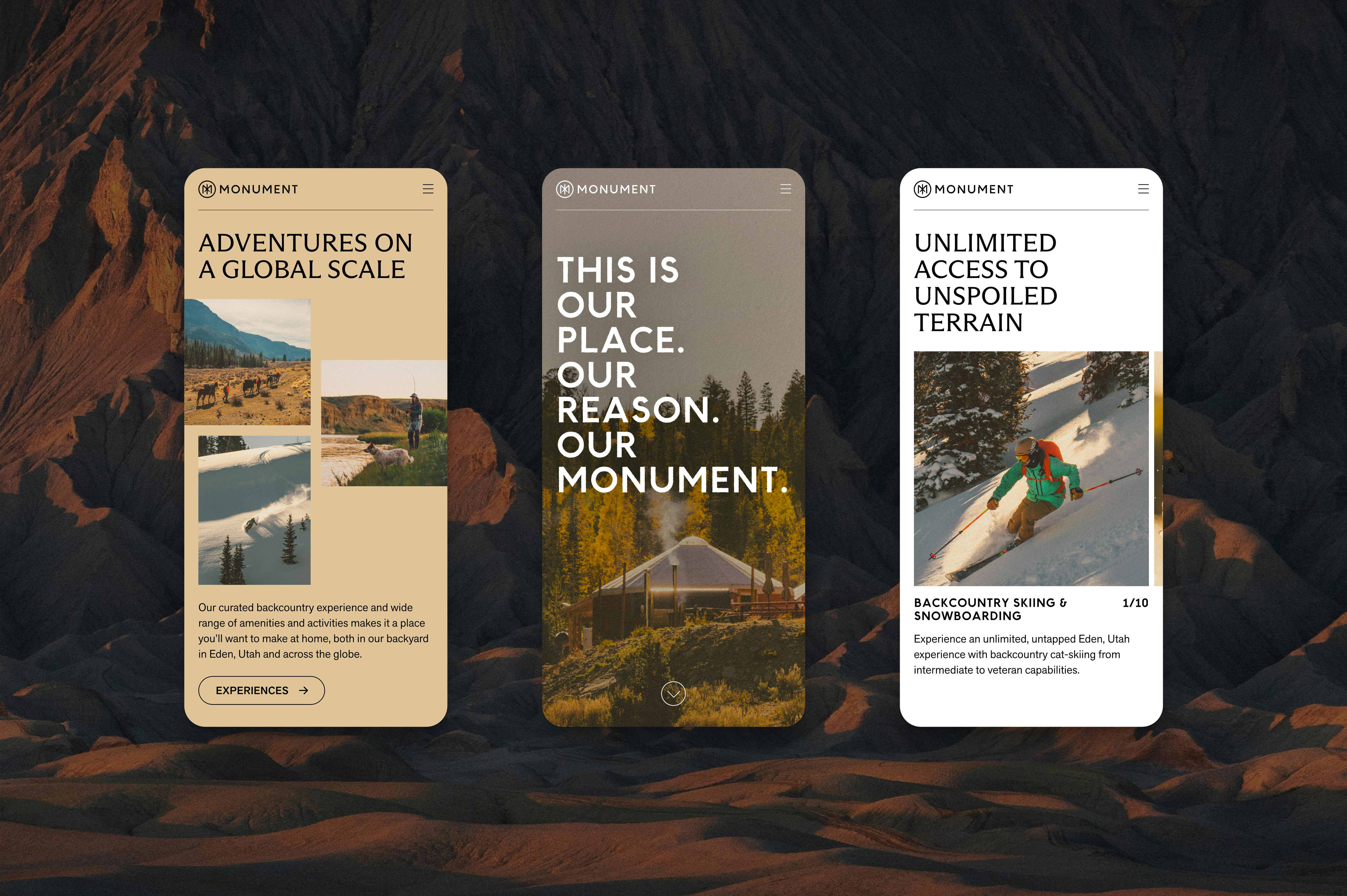 Monument is a private resort and adventure community located in Eden Valley, Utah combining luxury hospitality with world-class terrain. We partnered with the Monument team to create a brand identity system and digital experience that celebrates the spirit of endless adventure.